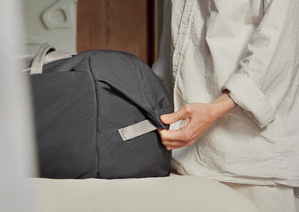 Если расстегнуть края сумки, образуется широкая горловина, благодаря которой упаковка будет проходить без усилий. Затем просто застегните молнию, защёлкните края — и готово.